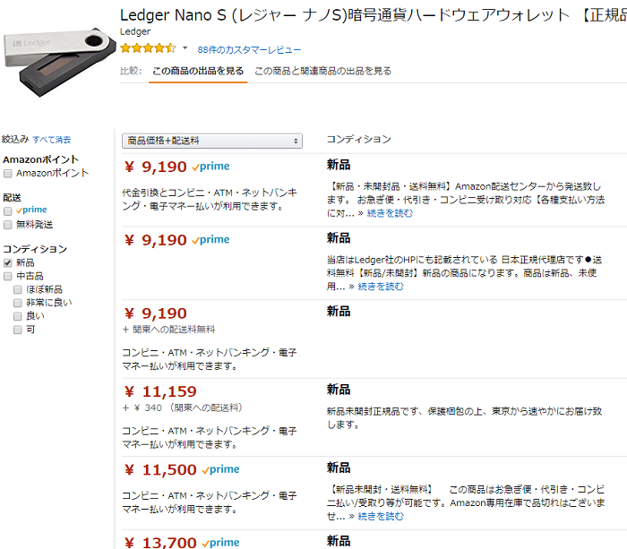 <参考>「Ledger Nano S(レジャーナノS)」の価格の比較